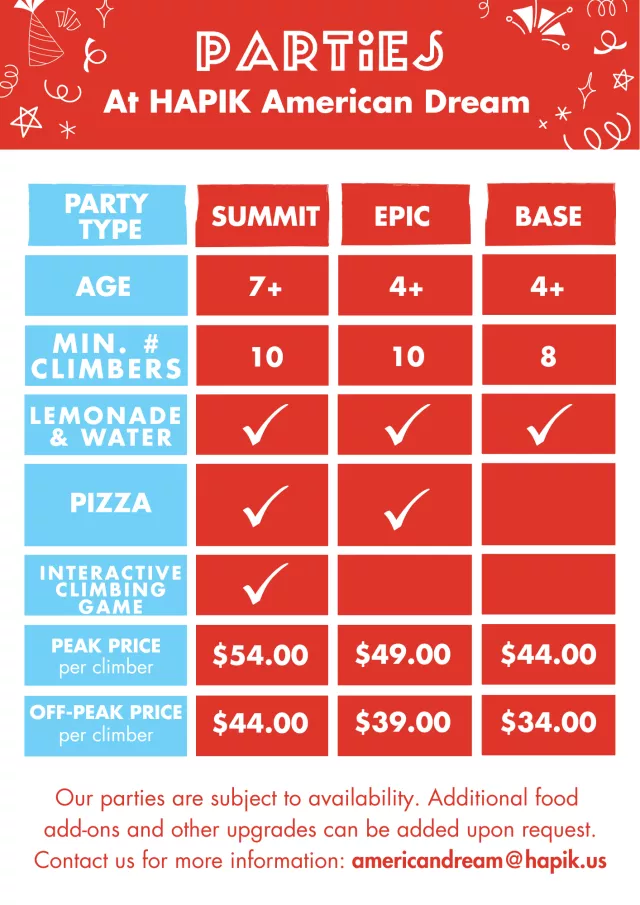 We offer competitive rates for schools (DOE vendor), as well as community groups. From age 4+ with a minimum of 10 climbers.